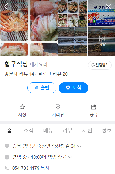 강구항 주변에는 대게거리가 조성되어 있어 다양한 대게 맛집을 찾아볼 수 있는데요. 가격은 시세에 따라 다르지만, '전현무계획2'에서 소개된 맛집에서는 한 마리에 3만원이라는 저렴한 가격으로 즐길 수 있었습니다